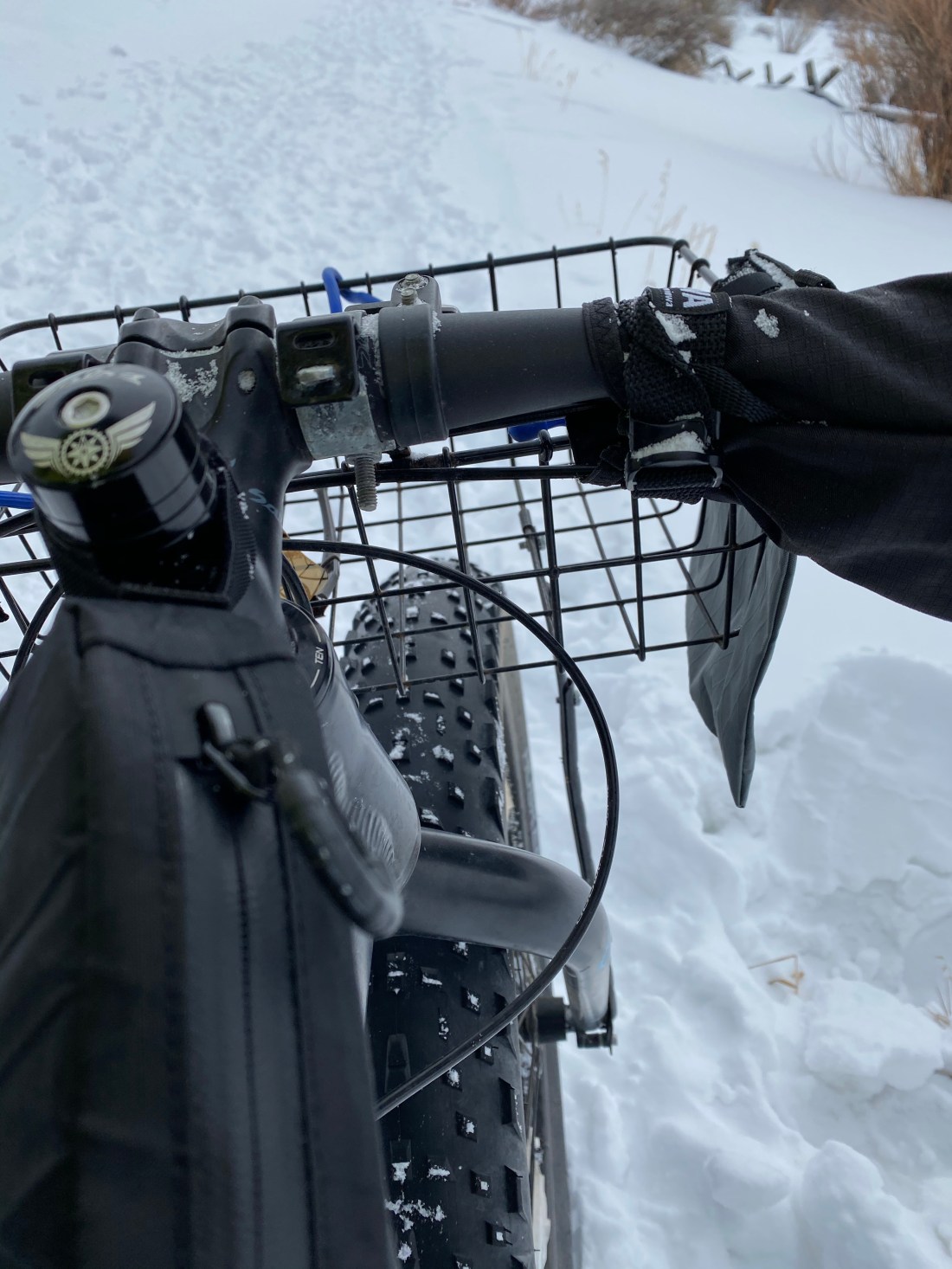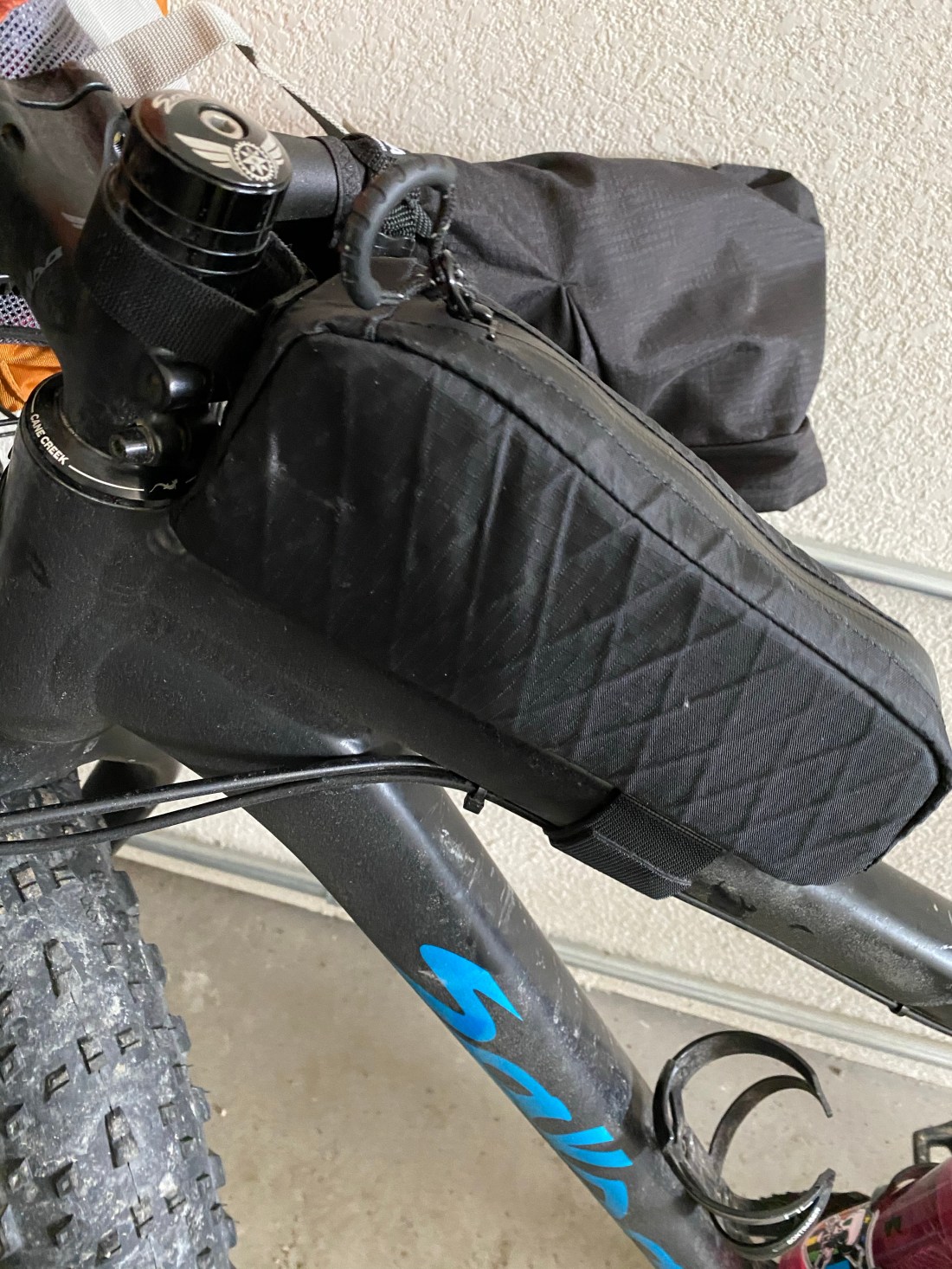 I attached the Bontrager Adventure bag to the fat bike using just the two wide Velcro strips and first took it out on some very cold, very snowy rides in Colorado. I experienced the same issue I had with the Revelate bag – knocking it sideways every time I came off the saddle. Maybe in summer clothes I could make a conscious effort not to come so far forward, but eh, why do I want to use gear I have to think about? Like the Revelate, it never appeared at risk of detaching from the top tube, but it was annoying.