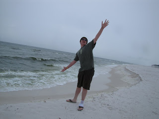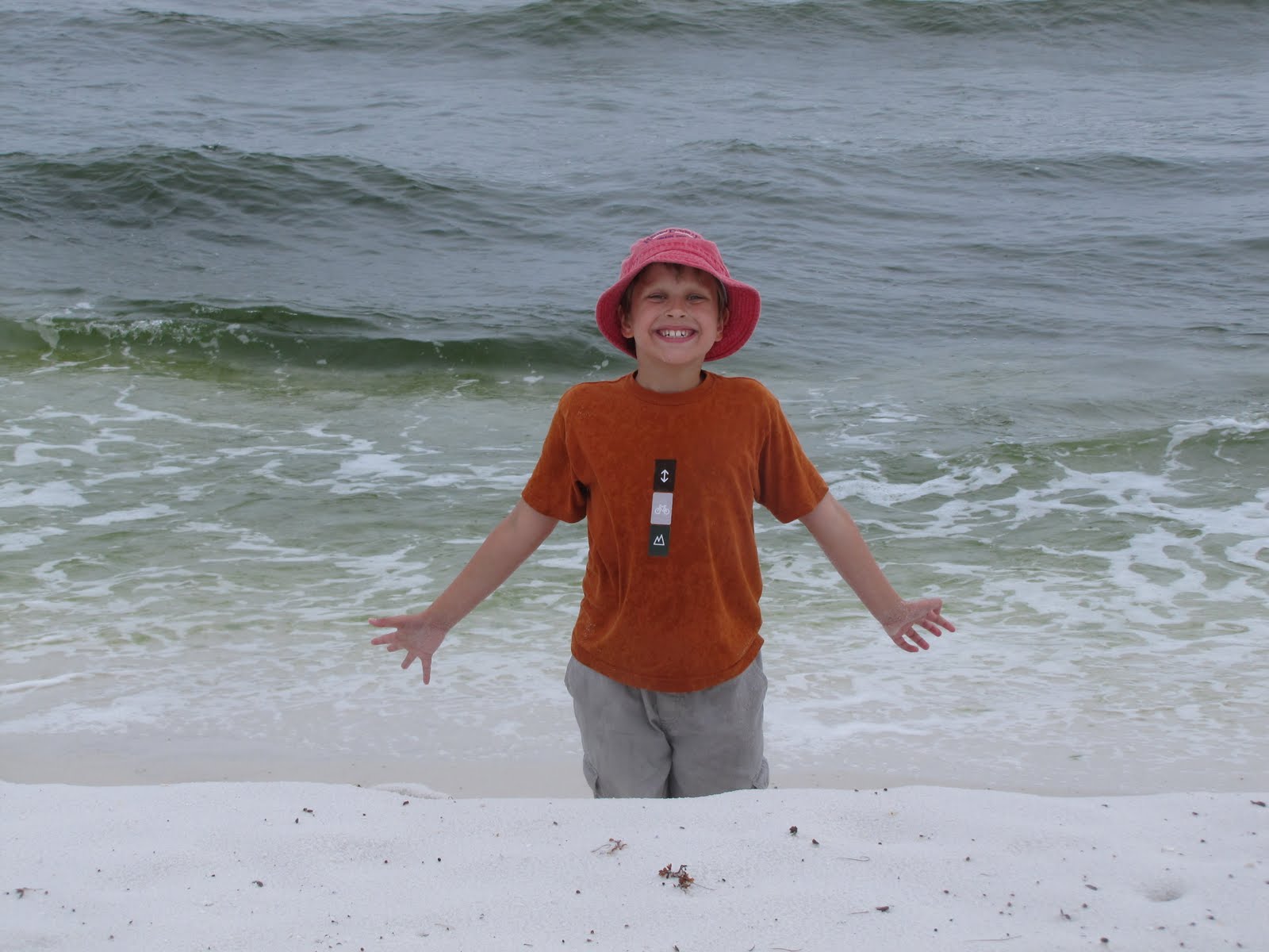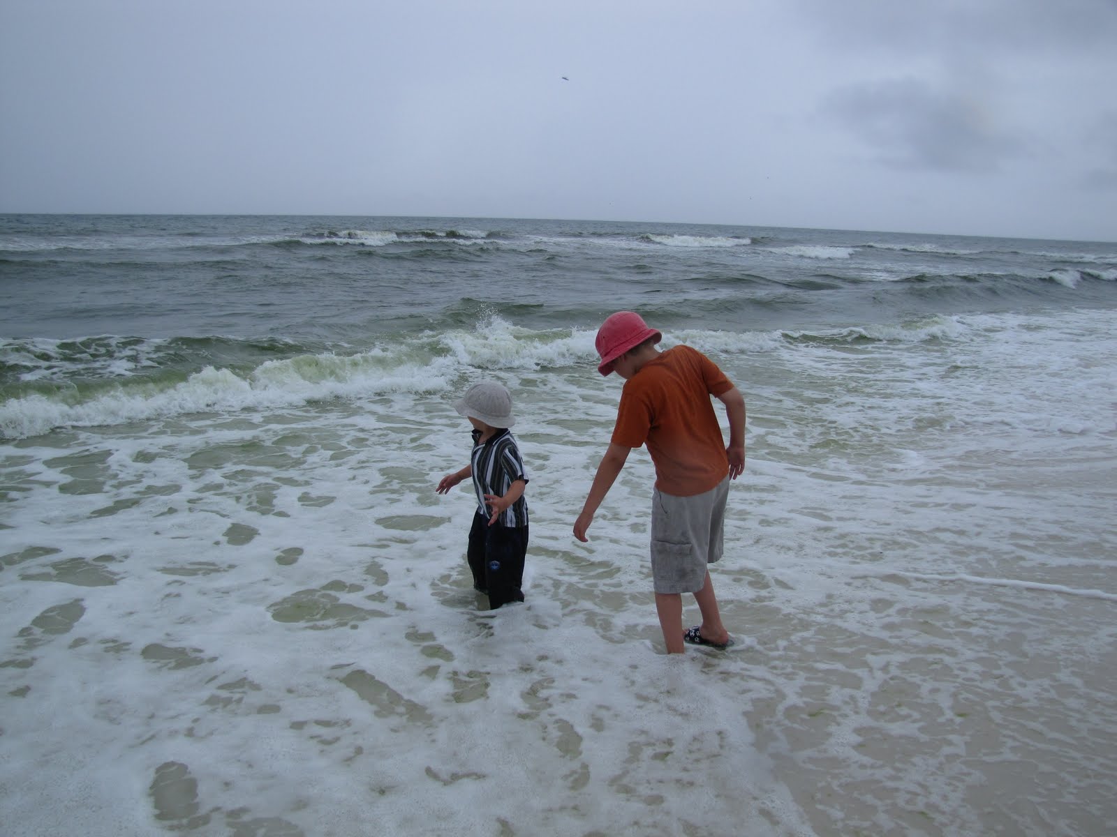 We got in the water though it was very rough. Jack had a great time scooping up tiny mussels in his palm and watching them burrow quickly into the sand. He had a bucket of them for awhile, and (you know what’s coming) asked if we could take them home. No, Jack, we couldn’t keep them alive. I felt mean telling him, but pointed out anyway that if the oil gets worse here, they’ll all be dead anyway.